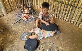 My brother goes to harvest fruit to sell to buy food for me and him to use.
